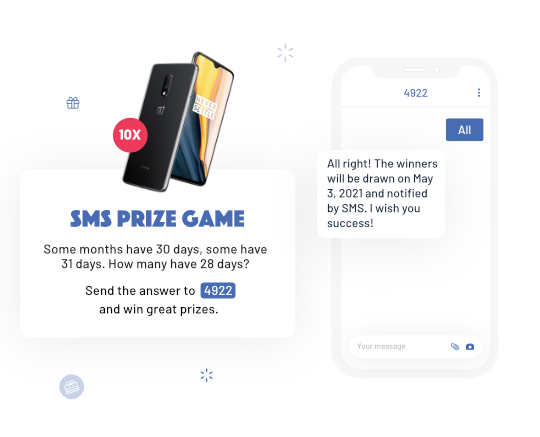 Mund të organizoni lehtësisht lojëra dhe konkurse shpërblyese përmes SMS. Nuk ka kanal më efektiv se SMS për të kontaktuar me klientët ekzistues dhe të rinj, veçanërisht kur bëhet fjalë për përmbajtje argëtuese si lotari.
